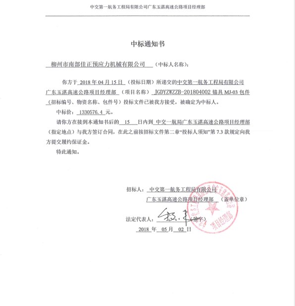 玉湛3包件中標通知書
