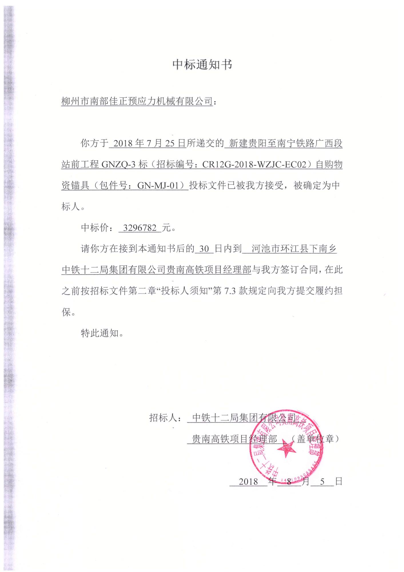 中鐵十二局貴南高鐵中標(biāo)通知書