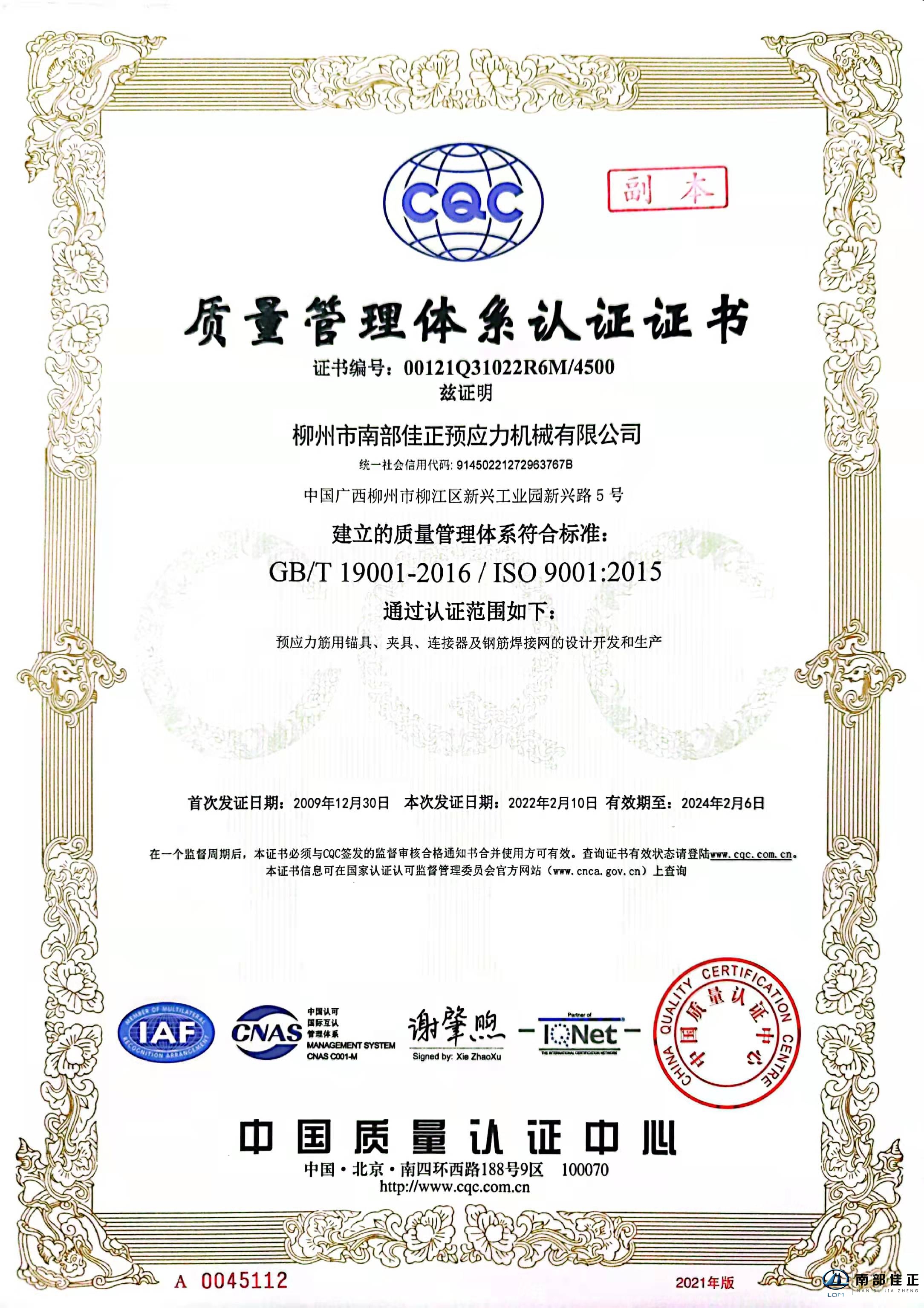 質(zhì)量管理體系認(rèn)證證書